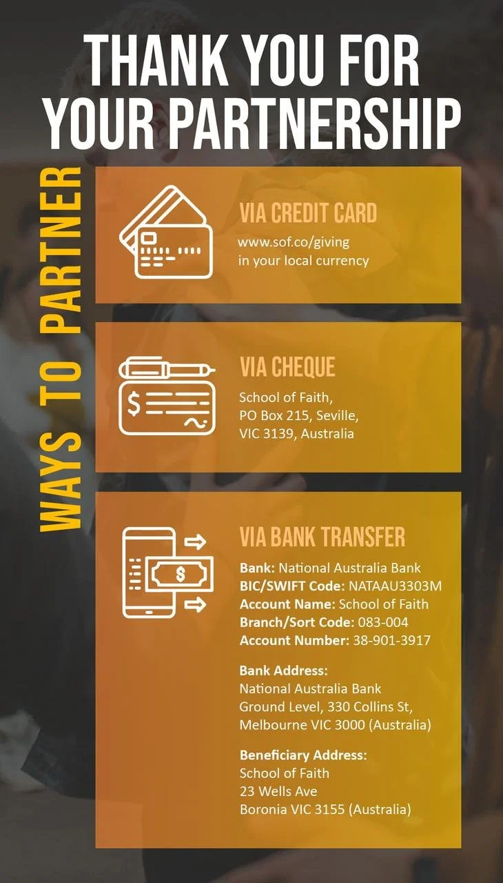 Our ministry, students and School always appreciate your partnership! We know that the body of Christ is the most powerful when we move in unity to achieve our goals. Scroll down to give via Credit/Debit Card.